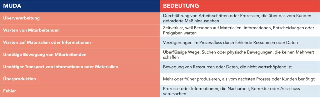 Um Flusseffizienz zu schaffen, sollten Unternehmen gezielt nach Flussbremsen oder Verschwendung suchen. Was als Verschwendung gilt, hängt von den Eigenschaften und Anforderungen des jeweiligen Geschäfts ab. Allerdings wurde ein Modell entwickelt, das die sieben Arten von Muda definiert – anwendbar auf alle Geschäftsbereiche.