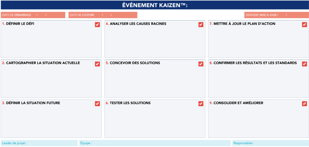 - Confirmer les résultats et les standards : mesurer les gains, stabiliser les améliorations et mettre à jour les standards ;