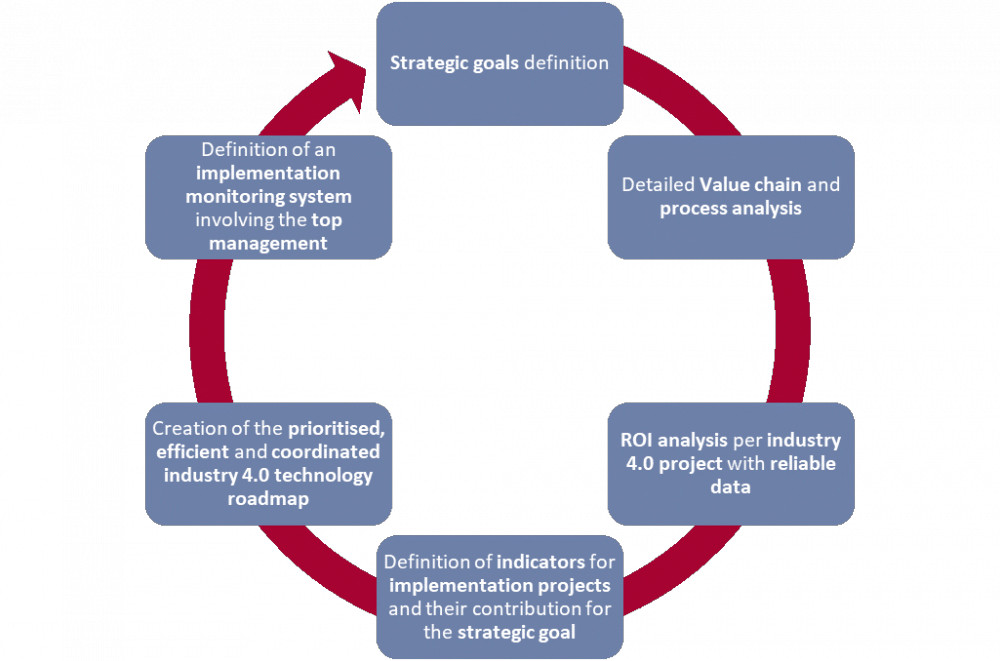 In response to the points mentioned above, the proposed implementation roadmap should begin with an Industry 4.0 strategic planning phase with the following steps:
