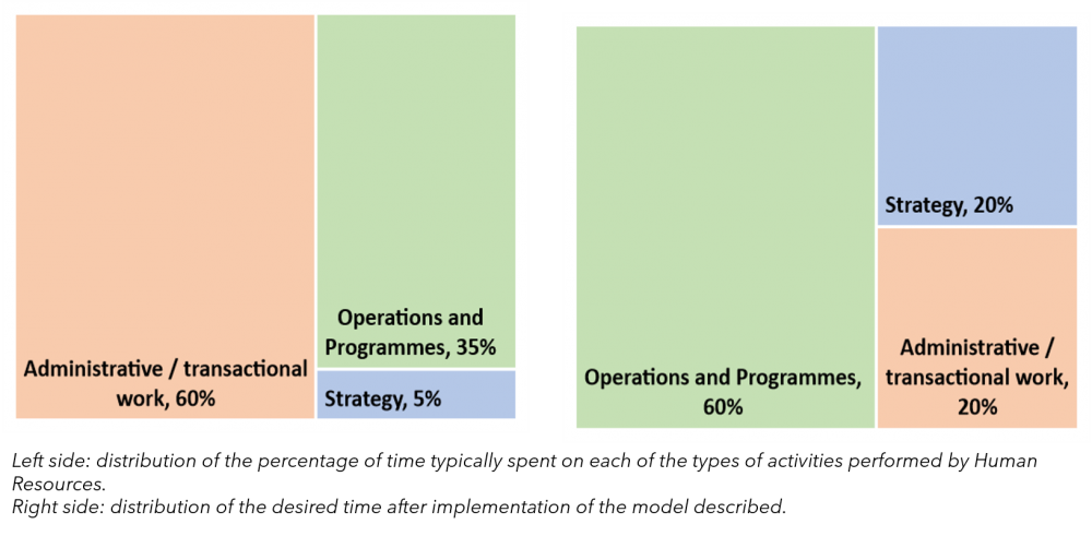The transformation of the Human Resources programme requires an in-depth analysis of the administrative work performed by the team. Typically, the time spent by these teams on transactional activities with little added value averages 60%. To invert the distribution of time spent on each process, as illustrated below, it is necessary to transform transactional work into support tasks with added value.
