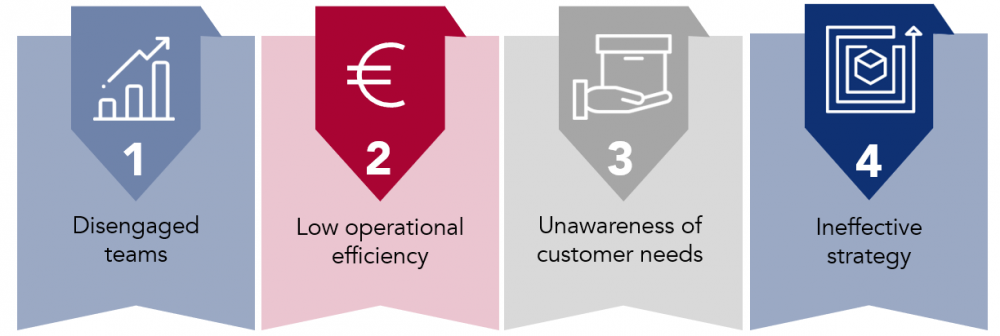 2. The second organisational change inhibitor is operating efficiency, a low value of which can block EBITDA, generate a longer cash conversion cycle and leverage CAPEX. These three pillars affect cash flow, which is essential to finance a company’s growth. A low operational efficiency is caused by a number of factors, including low service levels, low productivity of resources and/or equipment, rework due to quality problems or low team motivation amongst teams.