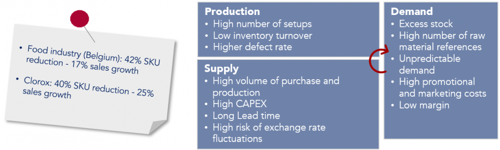 3. Companies reinforce their product portfolio as a way of increasing customer satisfaction and market share. However, strategies of this nature do not always come about as a result of the correct understanding of the actual needs of a customer. By following this strategy, companies incorporate two forms of complexity: the proliferation of products and the resulting increase of resources and specifications required. Procter & Gamble Co., after realising this, reduced the number of references of one of its core products, Head & Shoulders, from 26 to 15, which contributed to a 10% increase in sales. Managing a product portfolio has an impact on production, supply and demand: