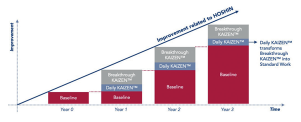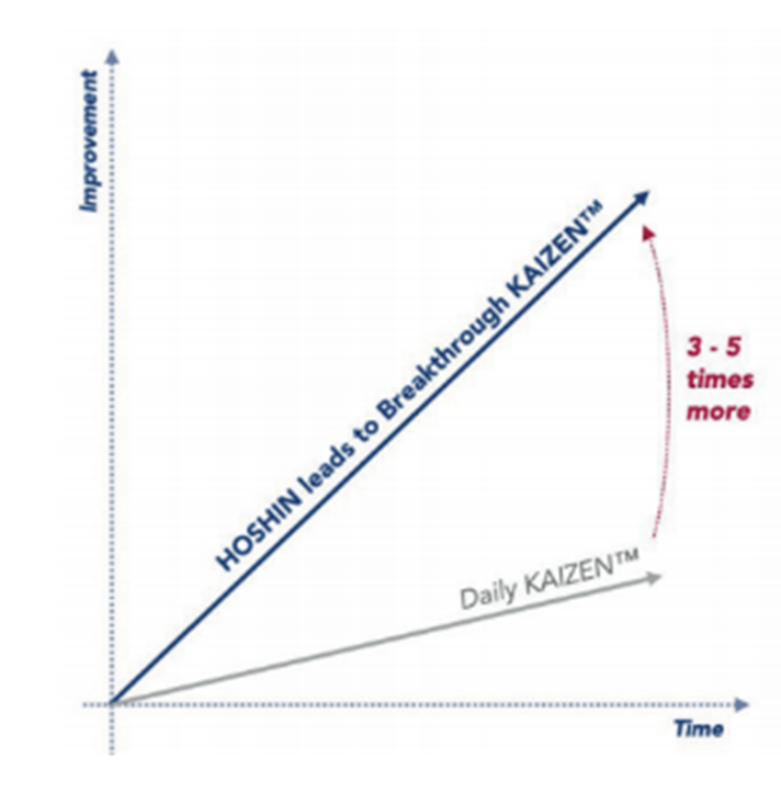 The following chart shows how Hoshin can support the implementation of these two KAIZEN™ approaches. The results achieved year after year are multiplied until the strategic objectives are reached.
