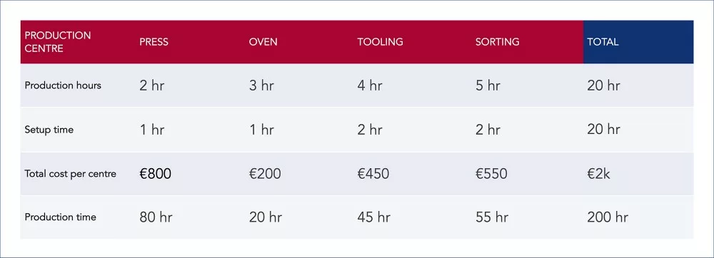 The existing costing system’s weaknesses were identified as: a) product costing did not consider the entire value chain, but only the production hours of a production point – the oven and b) the distribution of structure costs was based on production volume. For example, for an industrial cost of €2m and a total of 20 hours of oven time, the industrial cost per hour of production was calculated at €100. Thus, a product that required 3 hours in the oven would have an industrial cost of €300 regardless of the production times in the press, tooling and sorting.