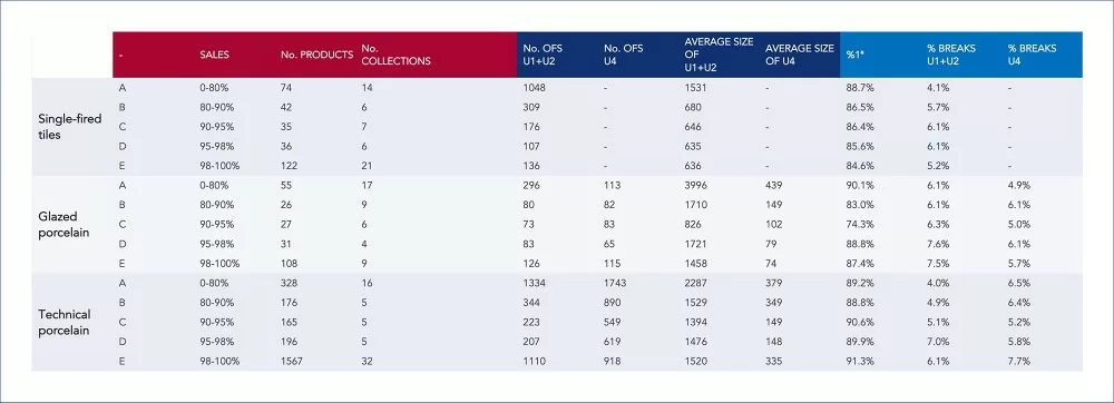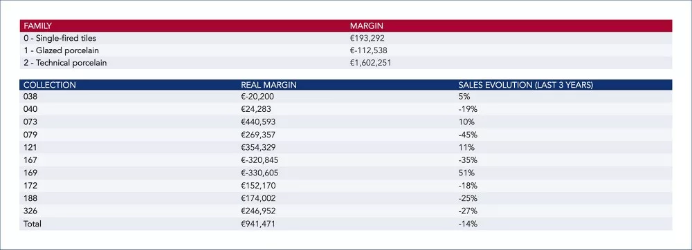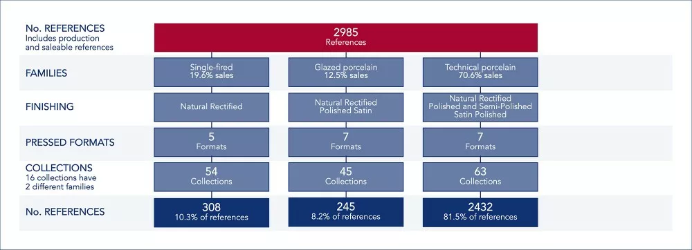 After reviewing the costing model, an analysis of the 2,985 product references was carried out, which were divided into 3 product families: single-fired tiles, glazed porcelain tiles and technical porcelain tiles and respective differentiation factors.