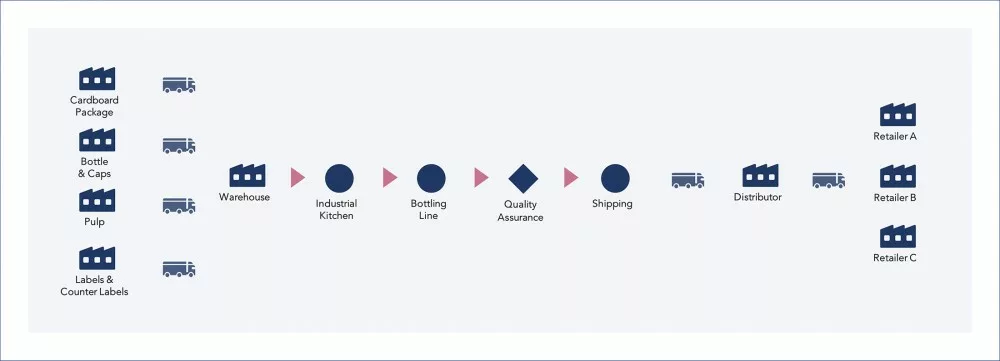 The final product is composed of three types of elements: raw materials, subsidiary materials and packaging materials. The formula itself consists of raw materials (fruit pulp) and subsidiary materials (water, preservatives, lemon, sugar and food coloring). Packaging materials comprise primary elements (glass bottles, cap and labels) and secondary elements (cartons, pallets and wrapping film).