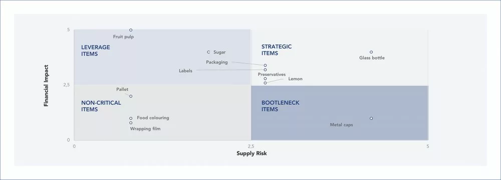The combination of the previous analyses made it possible to create a priority matrix, where the vertical axis shows the impact on the business (proportional to the total amount of the purchase) and, on the horizontal axis, the supply risk.