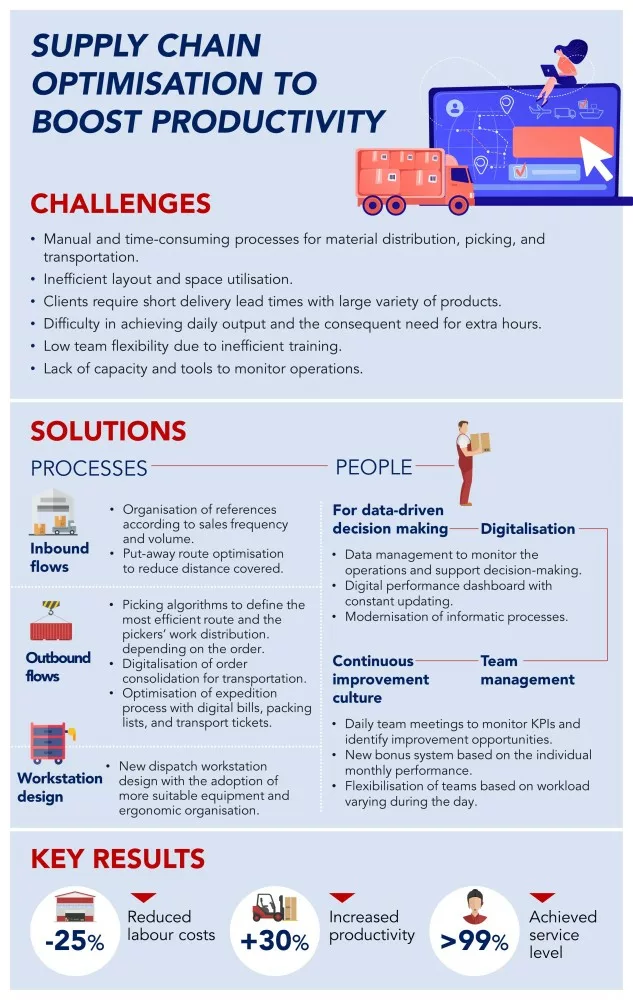 A weak supply chain performance will impact processes and teams’ productivity negatively. To optimise your supply chain for efficiency, you should implement improved logistics systems where the control is fully digital and personalised. By digitalising performance indicators, teams will be able to base decisions on real data and correct deviations. Your productivity will reach double-digit improvements.