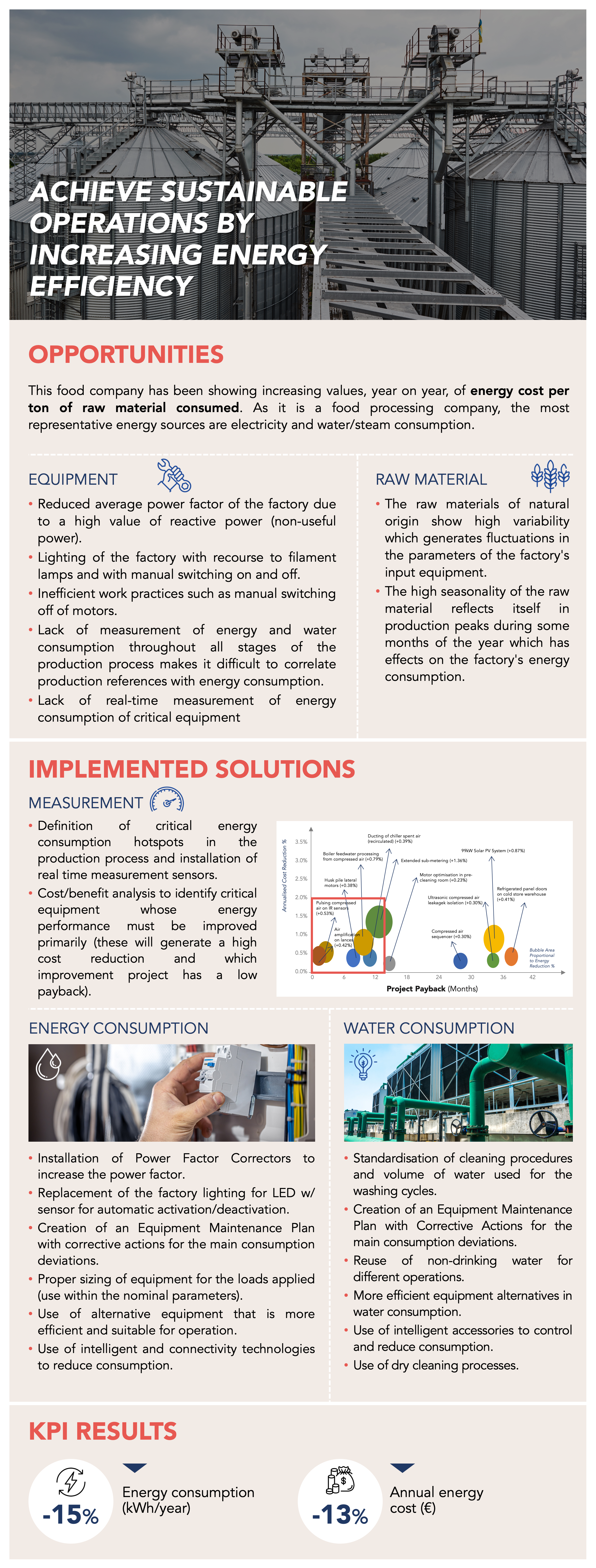 The costs associated with energy consumption in the Food & Beverage industry significantly impact these producers’ cost structure. Meanwhile, government incentives and consumer pressure for a transition to sustainable operations with reduced impact on the consumption of natural resources are increasing. This led this food producer to transform their operations to become more sustainable by improving energy efficiency. After implementing this transformation program, it was possible to reduce energy consumption by 15% (kWh/year), which translated into a 13% reduction in the annual energy cost.