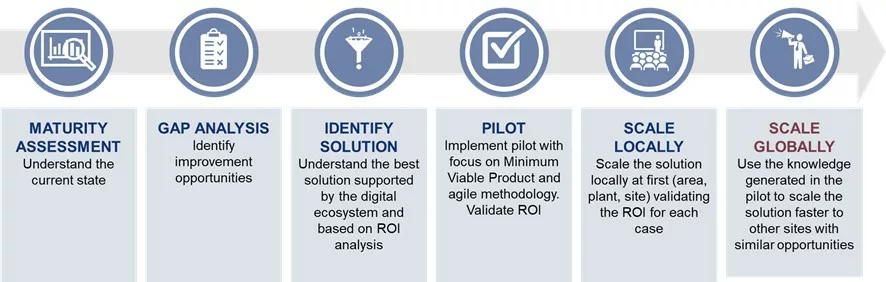 When basic stability is achieved and results are proven, the solutions are deployed to all other suitable areas. For fast and efficient scalability, the internal resources should set up a training and ramp-up process that takes advantage of the pilot experience gathered to smoothen the onboarding for the new implementation points.