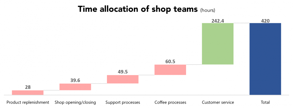 To overcome the challenge, the team began by surveying and observing all the activities performed by the shop teams. It was found that 42% of the time when the shop was open, the teams were unavailable for customer service, and dedicated to support activities instead. This situation was further compounded by the administrative burden borne by the shop manager, which made it impossible for him to actively manage priorities during the day.