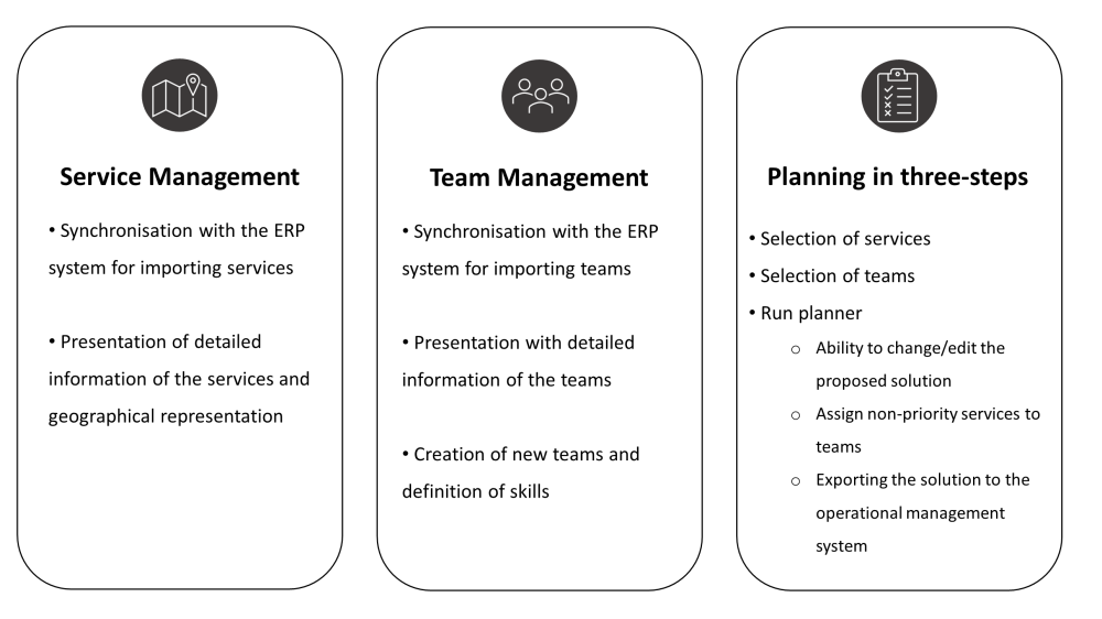 After this study, a software platform was designed and implemented. The platform integrates with the existing management software of the company and uses heuristic and meta-heuristic algorithms to solve the optimization process, taking into account the execution times of each type of service, the meter types and the availability of teams. Through a simple and user-friendly interface, users have the possibility to quickly and efficiently carry out the optimized planning of teams and carry out real-time monitoring of operations.