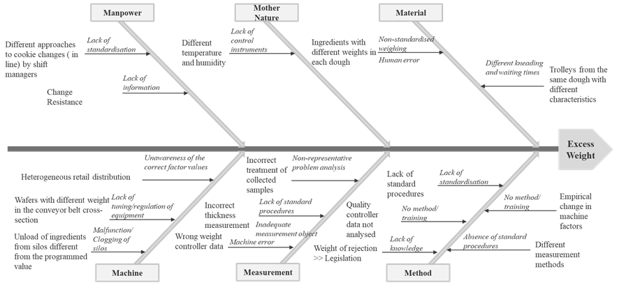 Thereafter, in a root cause analysis, the potential origins of the problem were discussed, organized by category into a Fishbone Diagram.