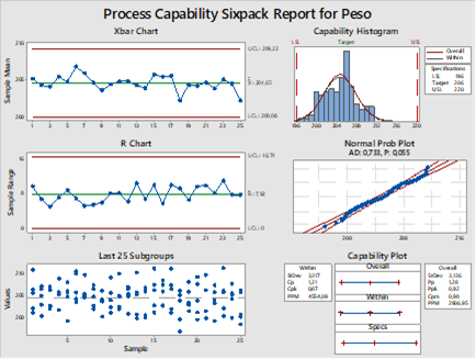 Through control charts, it was concluded that the process is stable and focused, being under statistical control, and is very close to having the capacity to produce packages within the minimum specifications initially defined by the company.