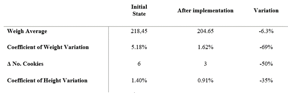 To eliminate the critical causes, an action plan was drawn up in parallel to implement the identified improvements. These included changes in the weighing process, standardization of the dough excess percentage range*, revision of the quantity of ammonium bicarbonate, adjustments to the kneading and dough resting times, standardization of the equipment parameters, and improvements to the quality control method.