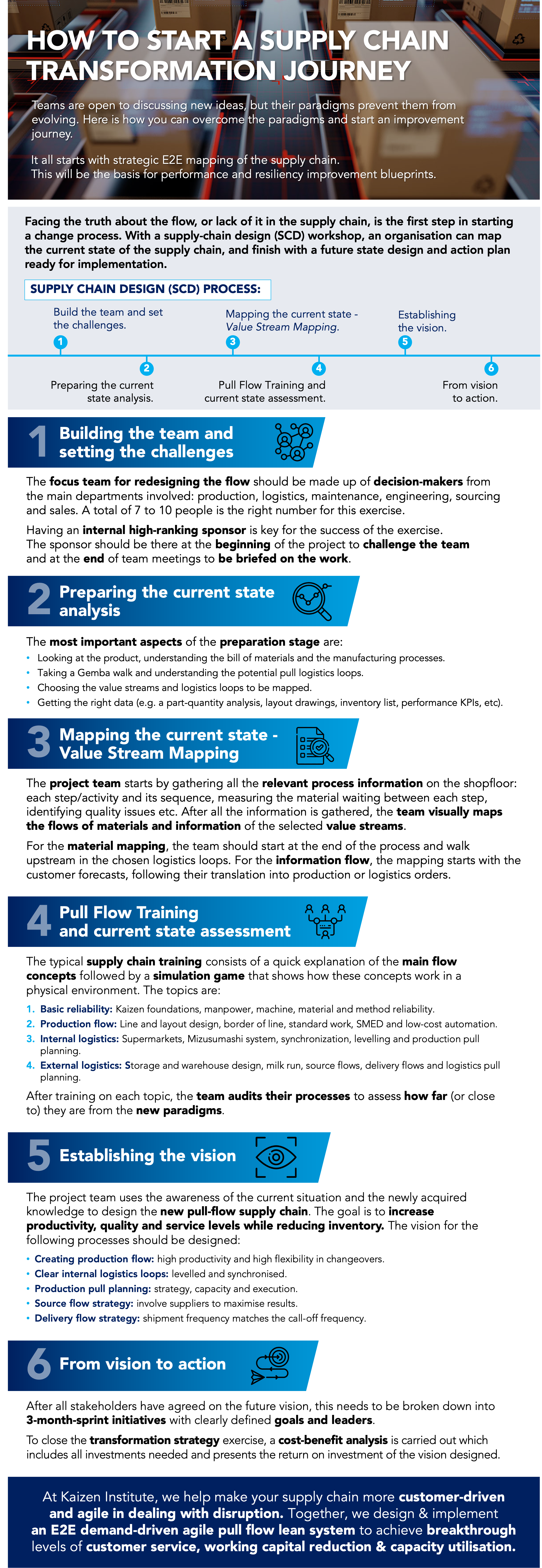 Due to the recent disruptions taking place, supply chain transformation is at the top of the leaders’ agenda. Organizations aim for more resilient operations that can adjust to future impacts on global markets and keep businesses running profitably. However, teams’ paradigms and current ways of working hold them down from envisioning a better operation framework. To kick-off this journey, we lay-out the first steps for a supply chain transformation: