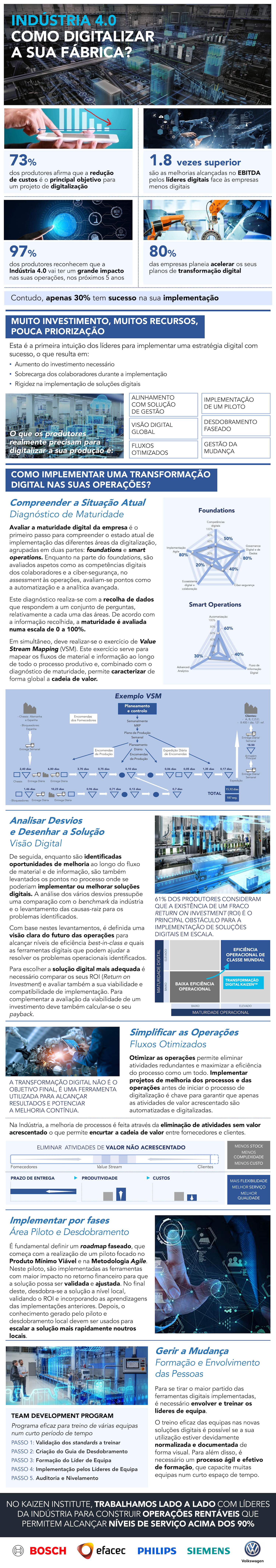 A Indústria 4.0 tem como objetivo a melhoria da eficiência e da produtividade dos processos. Alguns estudos indicam que as empresas que estão na vanguarda digital conseguem potenciar o seu crescimento de EBITDA 1,8 vezes mais do que os seus concorrentes menos digitais. No entanto, implementar um projeto de Transformação Digital resulta muitas vezes no aumento do investimento necessário, na sobrecarga das pessoas durante a implementação e na adoção de soluções rígidas.